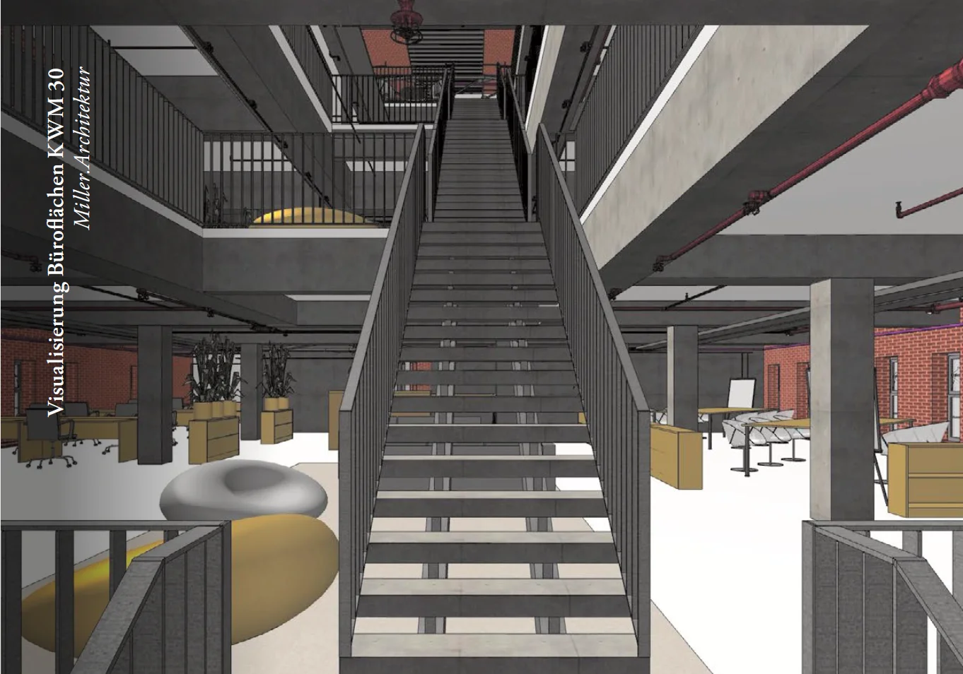 Makerspace, großer Konferenzbereich, Himmelsleiter verbindet alle Stockwerke, Coworking Space, Klimatisierung über Betonkernaktivierung in allen Stockwerken.