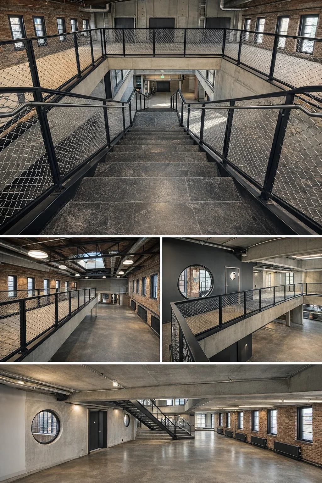 Makerspace, großer Konferenzbereich, Himmelsleiter verbindet alle Stockwerke, Coworking Space, Klimatisierung über Betonkernaktivierung in allen Stockwerken.